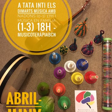 Ja fa  diversos trimestres que Musicoteràpia BCN  ( http://www.musicoterapiabcn.com)  juntament amb els seus col·laboradors oferim sessions setmanals de Música en Família i Música amb Nadons a Tata Inti ( http://www.tatainti.org) . Per aquest nou Trimestre ABRIL-JUNY us informem dels grups: Dimarts 17h : Música amb Nadons (0-1) sessions conduïdes per Alvaro Saura Dimarts 18h: Música en … More Musicoteràpia BCN : ABRIL-JUNY Música en Família i Música amb Nadons a Tata Inti
